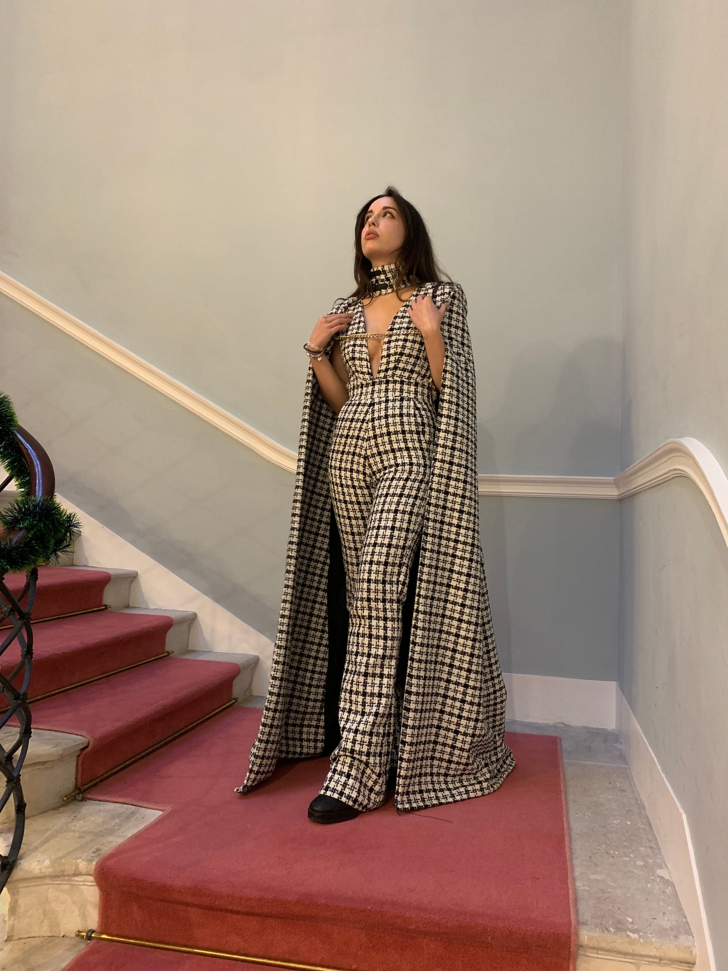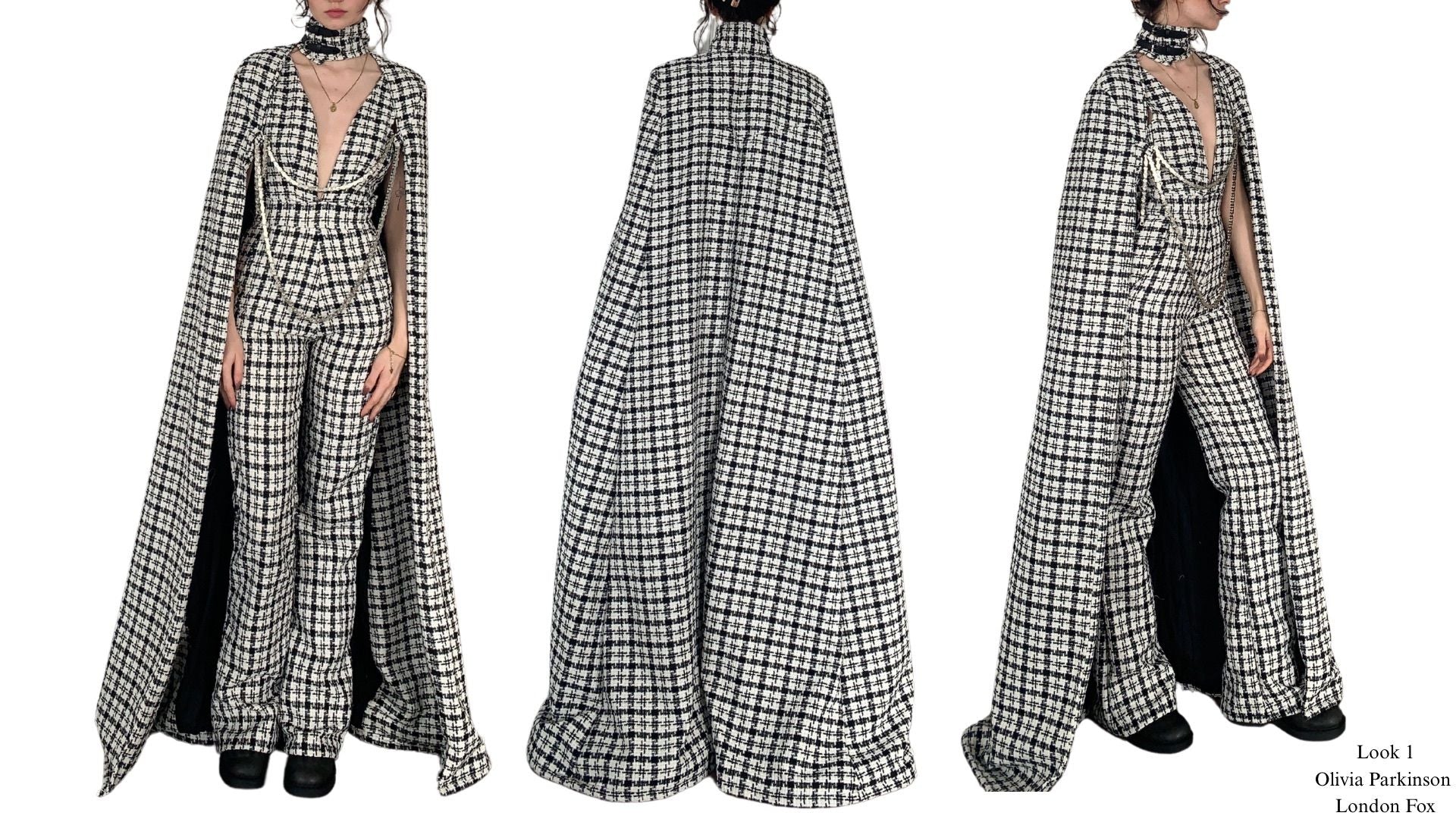 Introducing The Ace Suit — a bold fusion of West London’s iconic motorbike culture and refined British tailoring. Cut in wool blend tweed with a razor-sharp silhouette, this jumpsuit nods to the rebellious spirit of the 1960s Ace Café, reimagined through a high-fashion lens. The dramatic floor-length cape evokes movement and majesty with genuine bike chain fastenings, while precision piping and a sculpted waistline bring structure and strength.